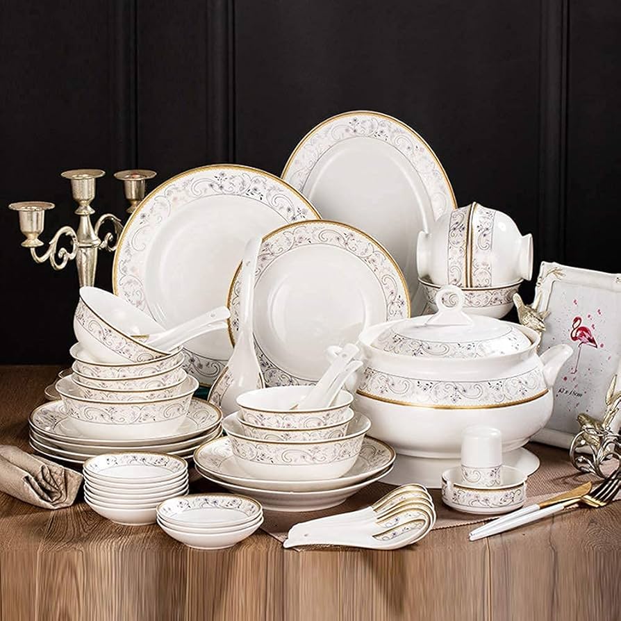 Dine in style with this exquisite fine china set. Hand-painted gold trim and delicate patterns grace each piece. This 60-piece set serves 12 and includes dinner plates, salad plates, bowls, and serving pieces.